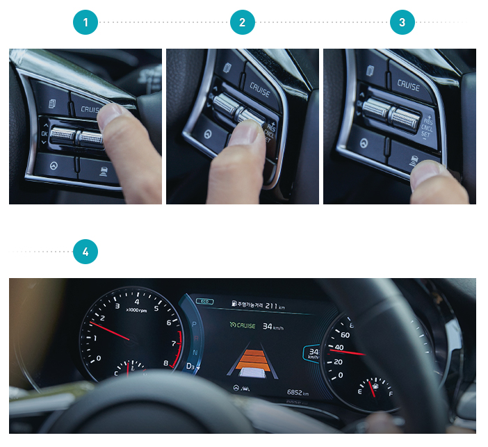 작동을 위해선 스티어링휠에 있는 ‘크루즈(CRUISE)’ 버튼을 누르고 원하는 속도(셀토스의 경우30km/h 이상 180km/h 이하)까지 가속한 후에 크루즈 버튼 아래 레버를 내려주면 됩니다. 이후 레버를 위아래로 조절해 원하는 속도를 변경할 수 있고, 레버 아래 버튼을 눌러 앞차와의 간격도 설정할 수 있습니다.